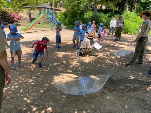 はじめは、なかなか傘の中に入らず苦戦の連続でしたが、何度もトライ