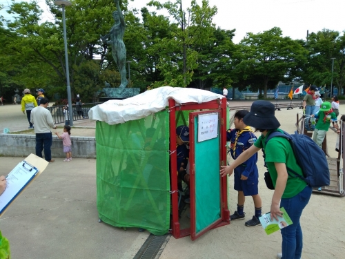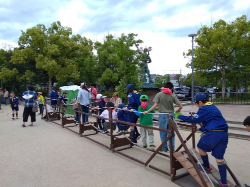 ペットボトルの水をみんなで協力してロープで運んだり、