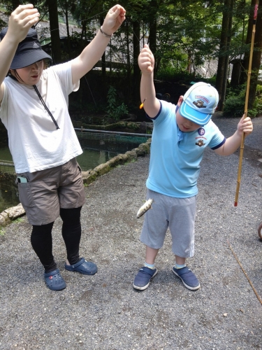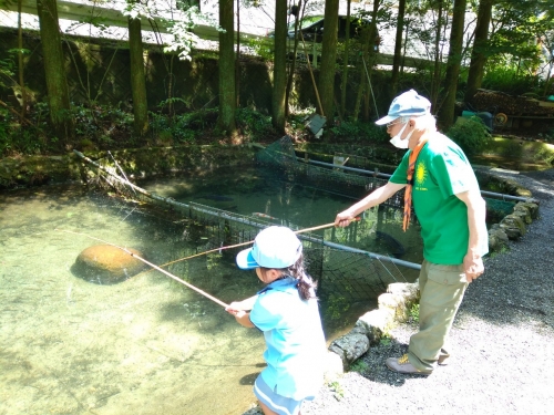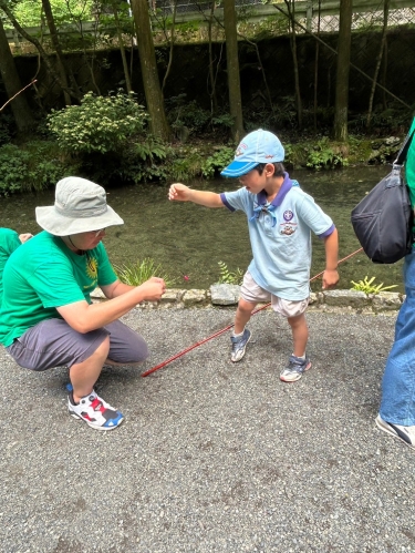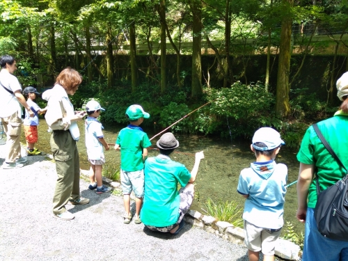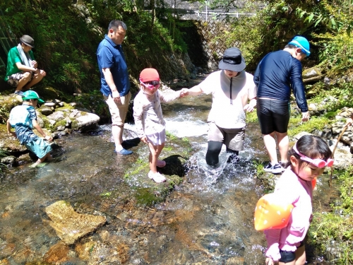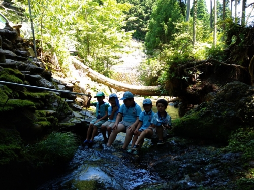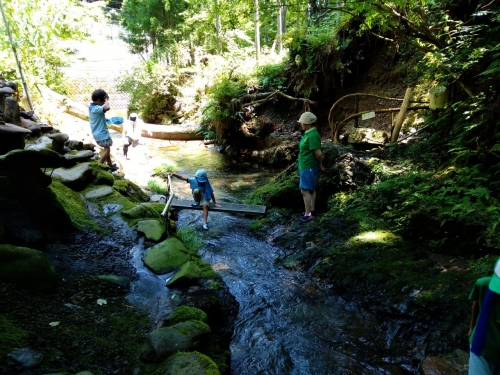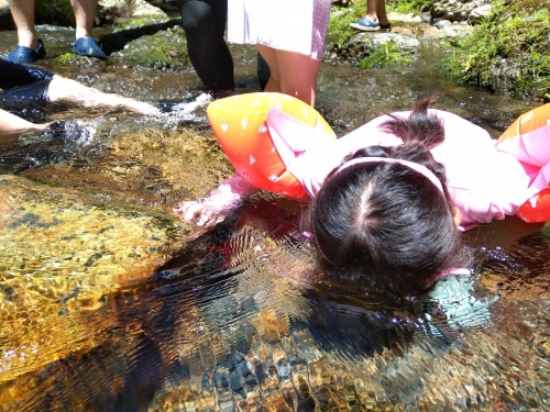 お昼ごはんのあとは、養魚場のすぐ横にある小川で水遊びをしました。
