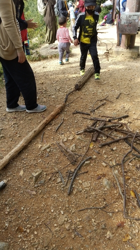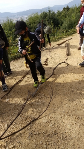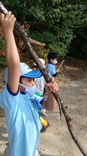 昼食後は、枝を集めて「長いものつなぎ競争」をすることにしました。