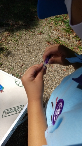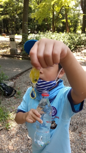 今日は勝山公園に集合! 会った瞬間「昨日のカミナリすごかったな~(゚o゚;」と話してくれるスカウトがいました。昨日の夕方に大雨が降った後、夜はひんやりと涼しく耳をすませば、秋の虫の音が聞こえていました。勝山公園に来る途中にトンボも見かけ、秋の訪れを感じます。でも、まだ日中は猛暑です。木陰の下にテーブルを用意して、「圧力」をテーマにした夏の工作活動を開始しました。