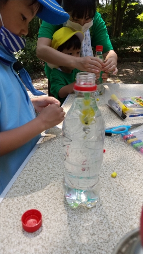 リーダーが「沈め~沈め~」と唱えながら手をゆっくり下に降ろすと、水中の魚のたれびんが下に移動し、「上がれ~上がれ~」と唱えるとこれまたゆっくりと上に上がっていく魚のたれびん!不思議な「浮沈子作り」に挑戦です。