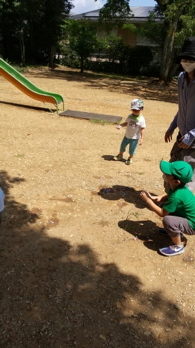 さて次は、「バブロケット」活動です。リーダーがやって見せた後、「やりたい人は手を挙げて~」と言うと次々と手が挙がりました。面白いから何回もパンパン、パンパン、パンパン、パンパン(*^o^*) と楽しむ子ども達。5~6メートルくらいフィルムケースが飛び上がっていた子もいました。これも圧力の仕業です。