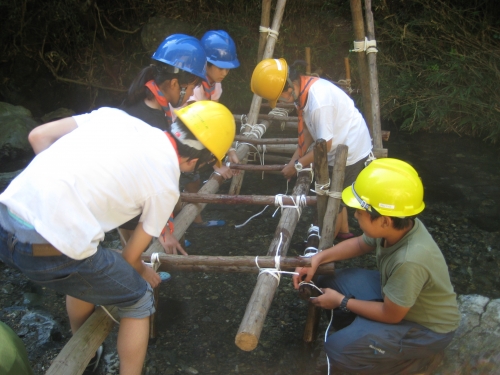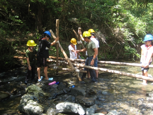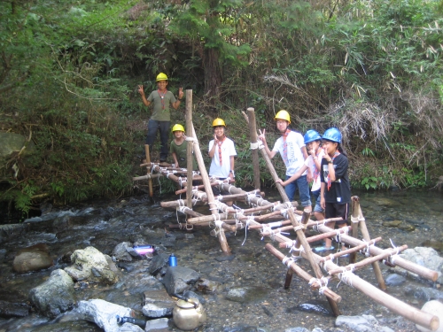 ボーイ隊 橋を架ける!ハヤブサの巻 タグ:キャンプ 2019-08-11 23:00:00 ハヤブサ班は2級スカウト3名がミーティングをこなして設計図、ミニチュア模型を作成。班集会でも班内で事前訓練をおこない準備を進めました。現地では若干の設計変更はおこなったものの、ほぼ設計通りの橋を完成。時間はギリギリで夕方4時までフルに使いましたが、立派なものです。コブラより距離がある分、途中でねじれたり、不安がある出来でしたが、その後強化をほどこして安定しました。強度はコブラに劣るものの、長い橋をほぼ設計通りに完成させたのは素晴らしいです。橋の長さは6m。