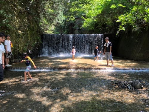 午後からも川遊びをし、スイカ割りもしました。それから少し早めに帰りのバスに乗り遅れないよう帰り支度を始めました。大型の掃除機で使用した場所を掃除しようとしていたら、「やりたい!」と言って、子ども達が積極的に手伝ってくれたので、大変助かりました。スムーズに帰り支度も進んだため、七谷川野外活動センターからも早めに出発でき、バス停に余裕をもって到着することが出来ました。ベンチに座りながらバスを待っていると・・予想通りこっくりこっくり眠り込んでしまう子が続出!今度は保護者のプチ試練の始まりです。眠った子を抱えてバスに乗り込むのは大変です。再びバスに乗って電車に乗り継ぎ、京都駅のホームで電車を待っていた時、スーパーボールのお土産を、あの電車とホームの暗闇に落としてしまい、大泣きしていた子どもがいたとの話を聞きました。その話を一緒に聞いていた未就学児に「少し分けてあげたらどうかな?」と提案してみたところ、スッーと泣いていた子どものそばに行き、決して多くはない自分の分を袋から2,3コ取り出し、泣いていた子の手の中に握らせてあげていました。それを見ていた年齢の高い子が「私は、お家にいっぱいあるから大丈夫だよ!」といって袋ごと泣いていた子に渡してあげていました。落とした分より増えているスーパーボールの袋を手にし、泣いていた子の表情が穏やかになっていくのがわかりました。このような優しい心を自然と使えるのは、きっと日頃からお家で大切に接してもらっているから出来ることなのだろうなぁ~と感じました。共に楽しい時間を過ごすことで、大切な仲間であるということも感じてくれているのではないかなと思いました。