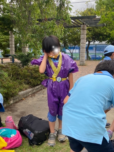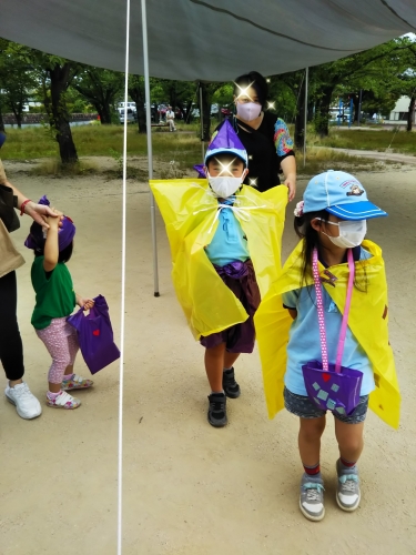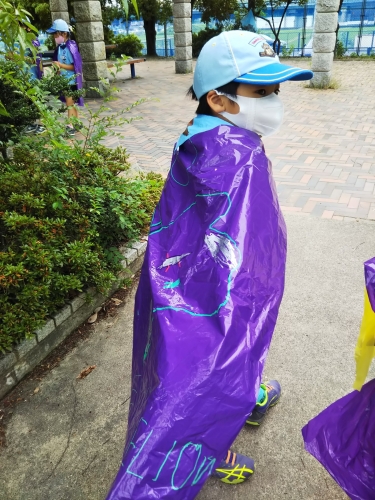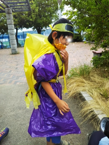 黄色と紫色のカラービニール袋で魔法のマントを作り、マジシャンらしく変装します。