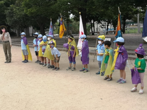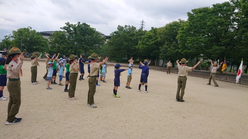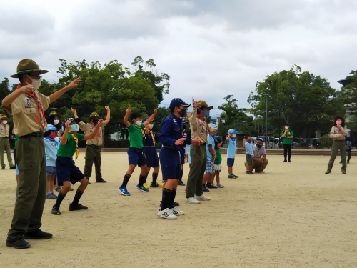 ふれあい広場にビーバー隊、カブ隊、ボーイ隊、支援のベンチャー隊、ローバー隊スカウトが集合しました。