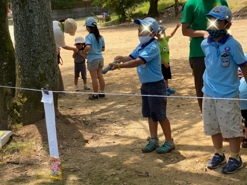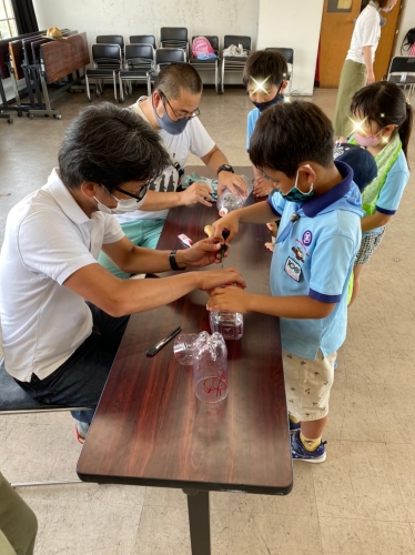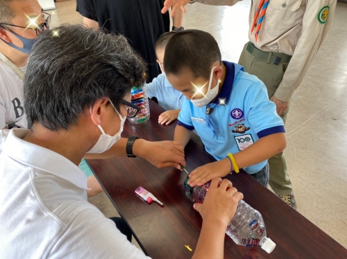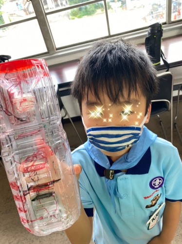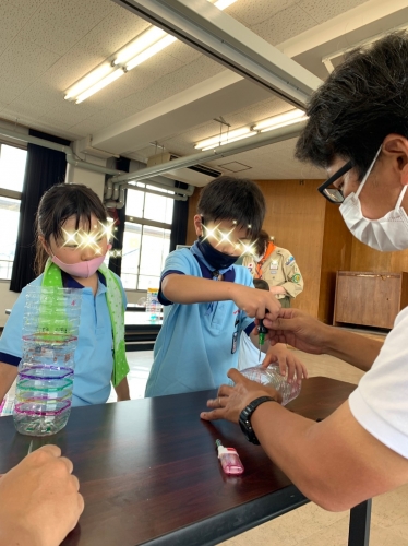 ビーバー隊 もんどり作り&水鉄砲 2021-07-25 22:09:19 令和3年 7月25日 本日は、もんどり作りと水鉄砲遊びを楽しみました。 もんどり作りは、ペットボトルに穴を開けるのが大変でした。 自分だけのもんどりが完成しました。 来週の川遊び活動でもんどりを仕掛ける際のエサは、色々なエサがあった方がどれかに獲物がかかる確率が高くなる! とのすばらしい意見をいただき、各自で調べて当日持参することになりました。(*^o^*) 本当にもんどりを仕掛けるの楽しみですね~(^O^)v 今日も暑かったですが、みんなで活動出来るのが嬉しいです。