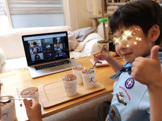 令和3年 5月23日(日) 今回は、オンラインで♡グミ作り♡に挑戦しました。ジュース、ゼラチン、砂糖をマグカップに入れ、スプーンでかき混ぜます。画面越しに楽しそうに作業をしているスカウト達の笑顔が見ら...